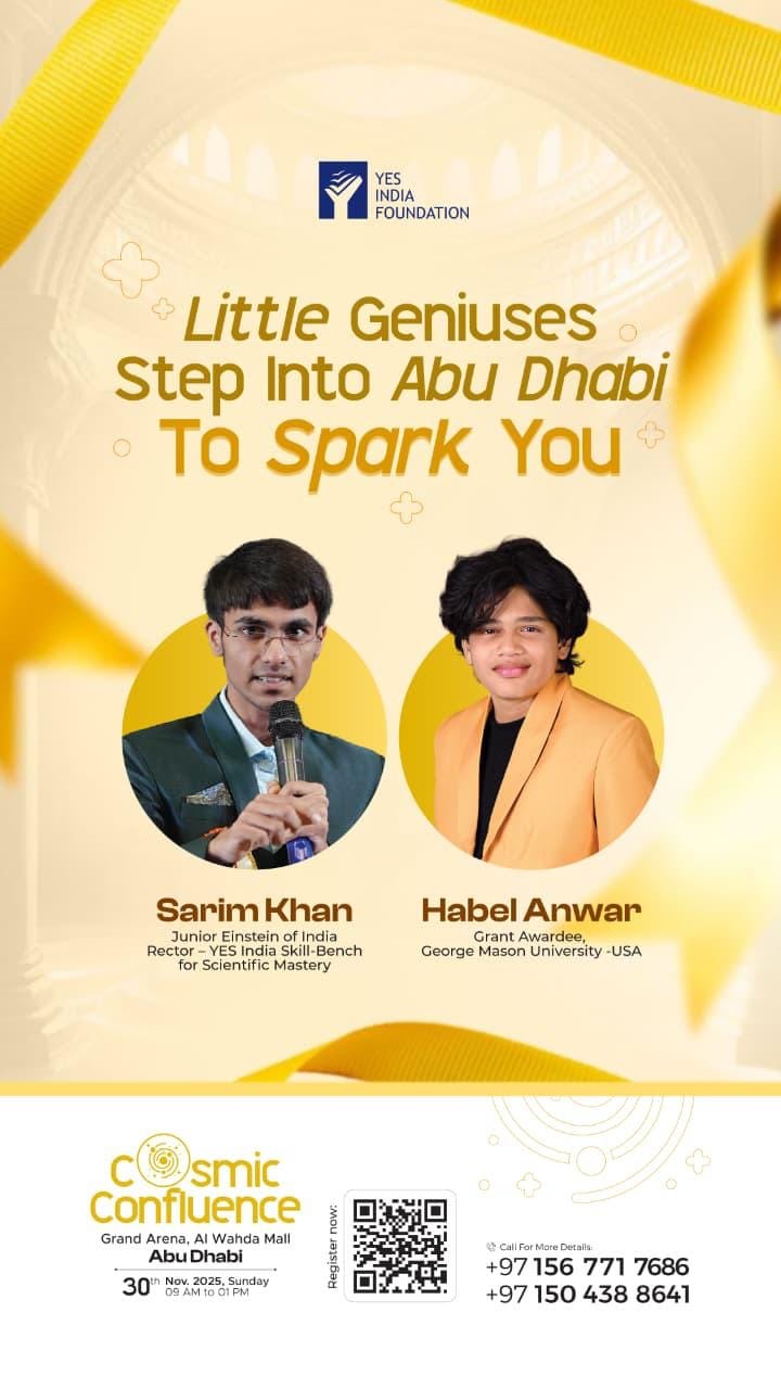 അബുദാബി: ശാസ്ത്ര ലോകത്തെ പുതുമകളും വിശേഷങ്ങളും അറിയാനും പങ്കുവെക്കാനും പ്രവാസി വിദ്യാർത്ഥികൾക്ക് അവസരം ഒരുക്കുകയാണ് യെസ് ഇന്ത്യ ഫൗണ്ടേഷൻ യെസ് ഇന്ത്യ കോസ്മിക് കോൺഫ്ലുവൻസ് ഇന്റർനാഷനൽ സയൻസ് സമ്മിറ്റ് നവംബർ മുപ്പതിനു ഞായറാഴ്ച്ച രാവിലെ ഒമ്പത് മണി മുതൽ ഉച്ചക്ക് ഒരു മണിവരെ അബുദാബിയിലെ അൽ വഹ്ദ മാളിലുള്ള ഗ്രാൻഡ് അറീന കോൺഫെറൻസ് ഹാളിൽ വെച്ച് നടക്കും ഏഴ് മുതൽ പന്ത്രണ്ടാം ക്ലാസ് വരെ ഉള്ള കുട്ടികൾക്കാണ് പ്രവേശനം ഇന്ത്യയിൽ നിന്നുള്ള രണ്ടു കൊച്ചു ശാസ്ത്രജ്ഞൻമാരാണ് അതിഥികളായി കോൺഫറൻസിൽ എത്തുന്നത്