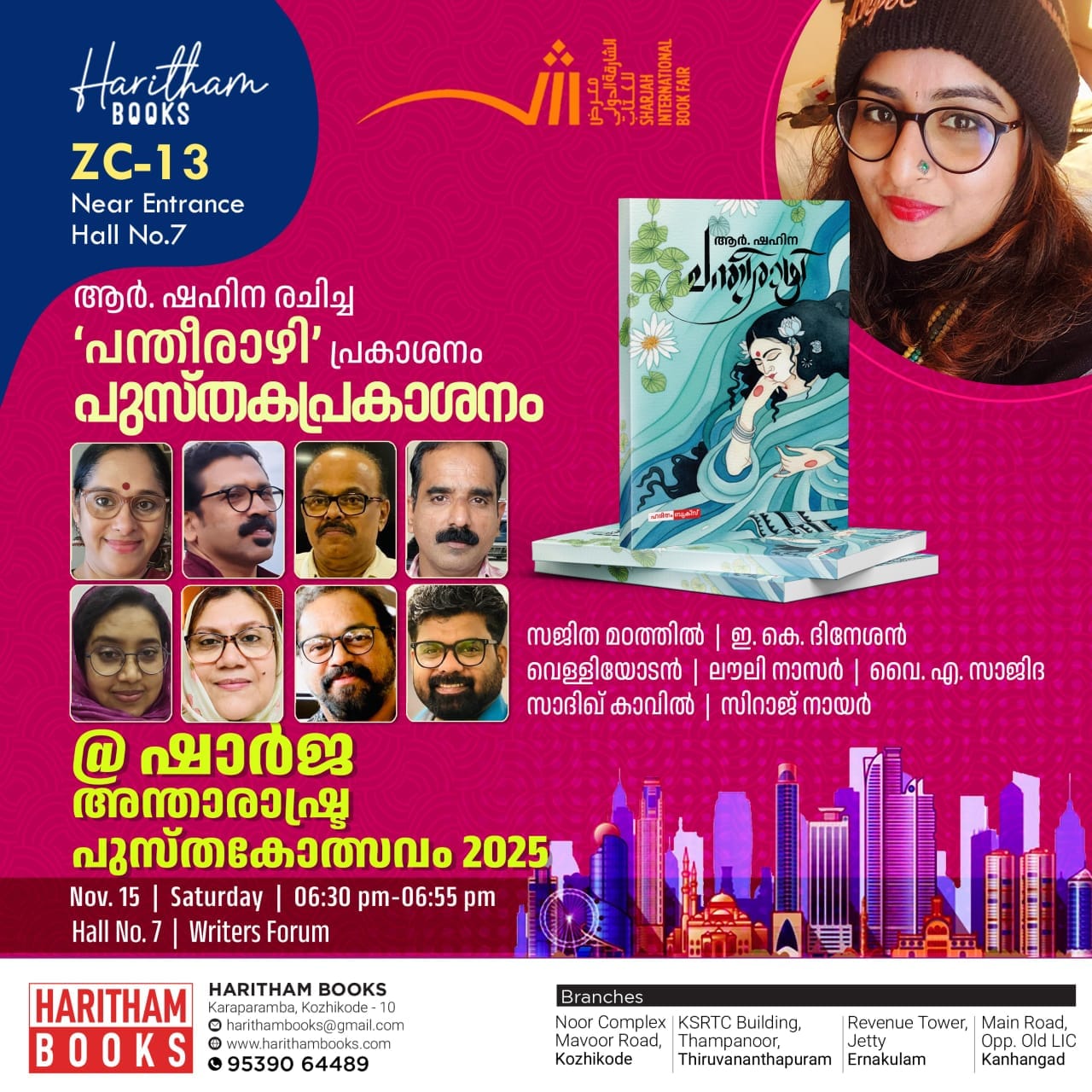 ഷാർജ . എഴുത്തുകാരിയും നർത്തകിയും അഭിനേത്രിയുമായ അഡ്വ.ആർ ഷഹിനയുടെ ഓർമ്മക്കുറിപ്പുകളുടെ സമാഹാരം പന്തീരാഴി ഷാർജ അന്താരാഷ്ട്ര പുസ്തകമേളയിൽ വെച്ച് പ്രകാശനം ചെയ്യും . 2025 നവംബർ 15 ശനിയാഴ്ച വൈകുന്നേരം 6 മണിക്ക് റൈറ്റേഴ്സ് ഫോറം ഹാളിൽ വെച്ച നടക്കുന്ന ചടങ്ങിൽ ചലച്ചിത്ര താരം സജിത മഠത്തിൽ എഴുത്തുകാരനും പ്രഭാഷകനുമായ ഇ കെ ദിനേശന് നൽകിക്കൊണ്ട് പ്രകാശന കർമ്മം നിർവ്വഹിക്കും . പ്രതാപൻ തായാട്ട് ആമുഖ ഭാഷണം നടത്തും .