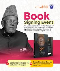 നവംബർ 15 ന് ഷാർജ എക്സ്പോ സെന്ററിൽ വായനക്കാരെ കാണുന്നതിനായി ജമാലുദ്ദീൻ തന്റെ മലയാള കവിതാസമാഹാരത്തിന്റെ അറബി വിവർത്തനമായ സംസം എന്ന പുസ്തകത്തിന്റെ പകർപ്പുകളിൽ ഒപ്പിടും.